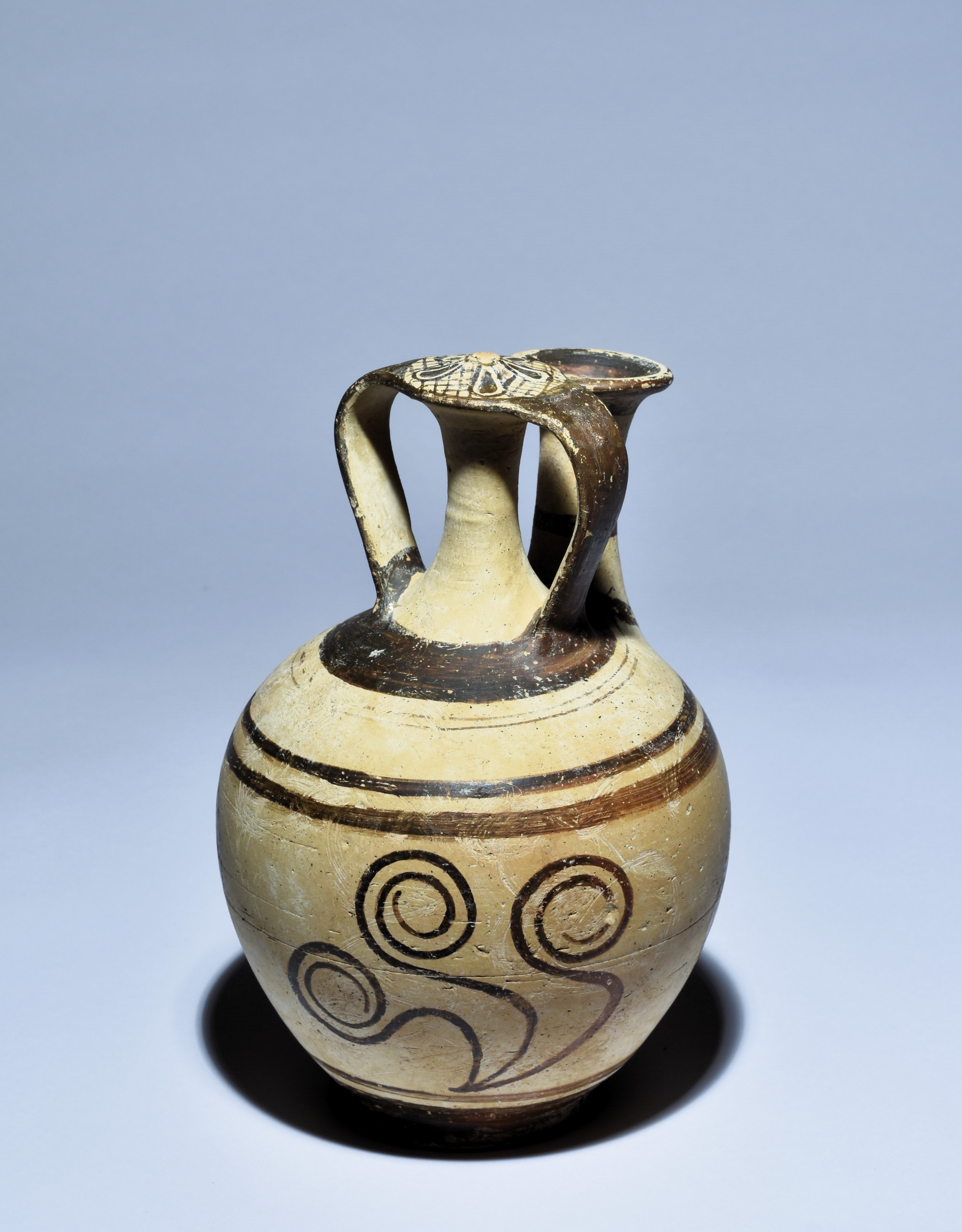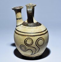 Large stirrup jar with two handles and a vertical spout. On the corpus three motifs, each consisting of three stemmed spirals, framed by circular bands. The domed knob decorated with net pattern and flower pattern above it. Intact, some retouching in places.