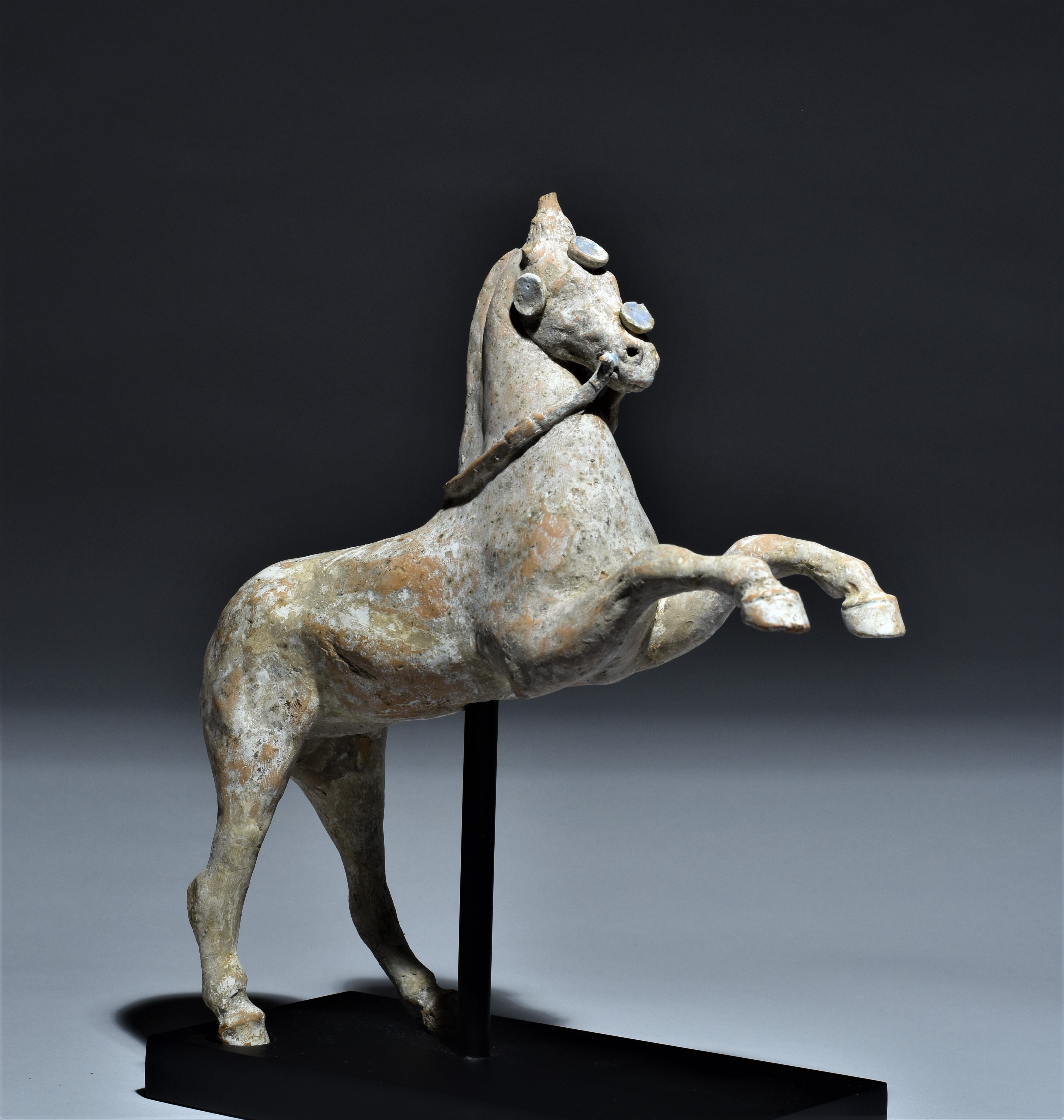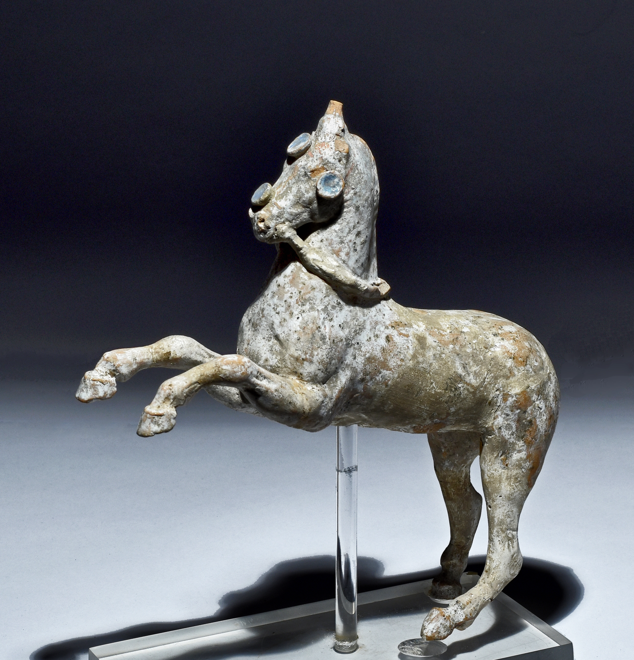 Statuette of a prancing horse with muscular body and well-modelled anatomical features. The horse wears an elaborate bridle decorated with four discs, the mane is tied with a top-knot. On the back a hole to attach the rider. Recomposed from fragments, tail and ears missing.