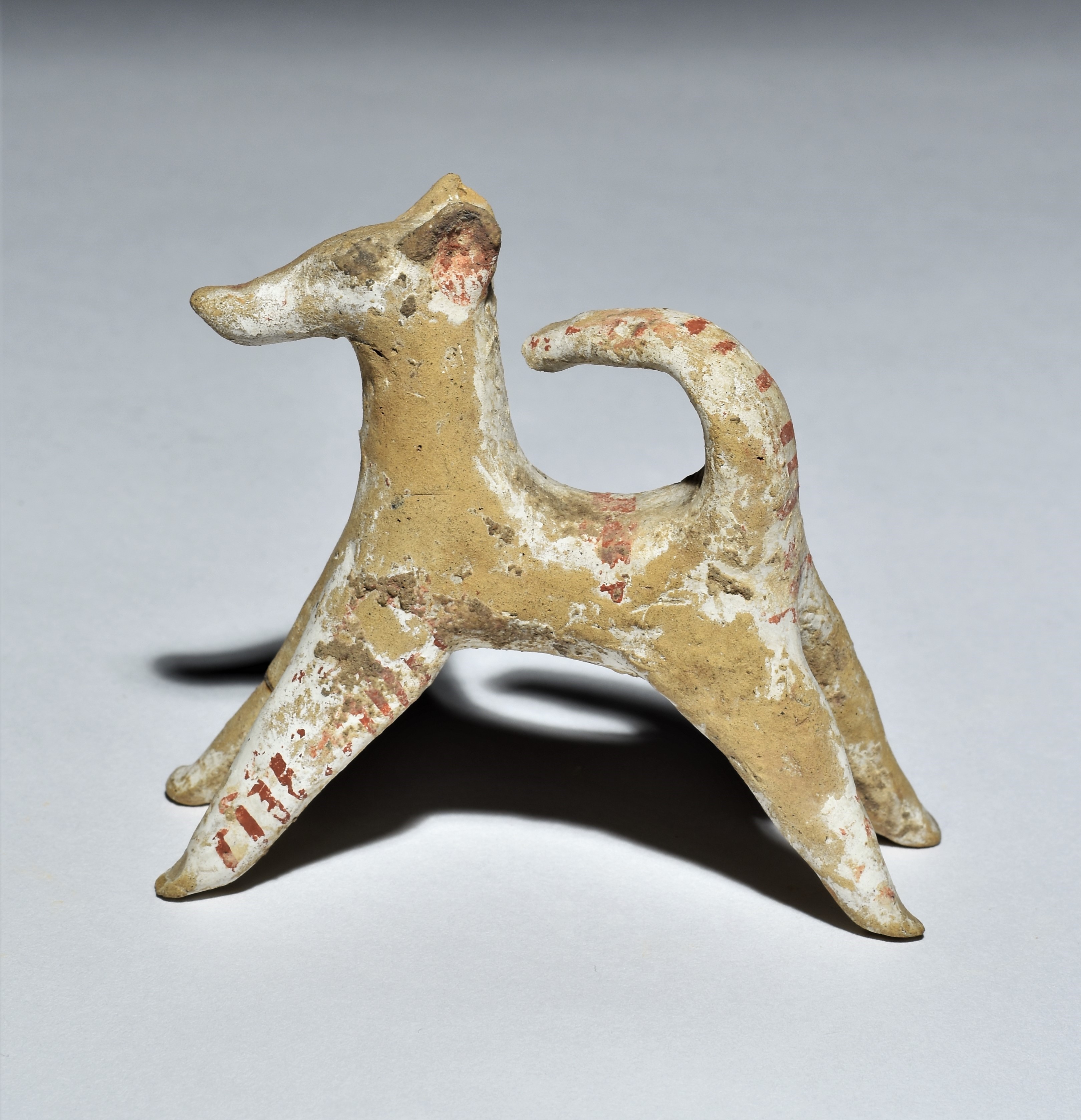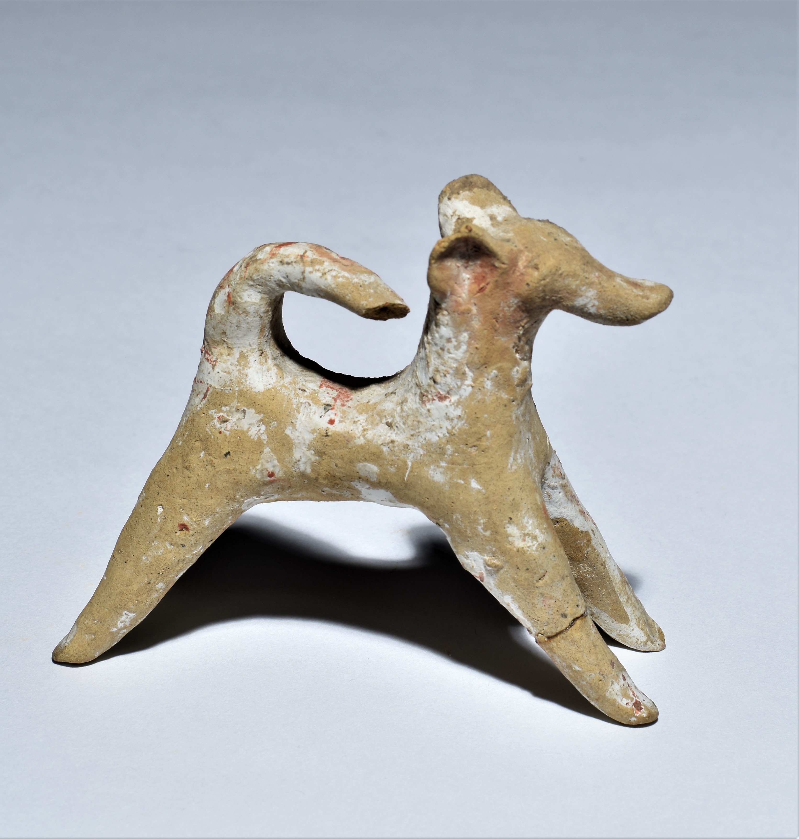 Figure of a standing dog with pricked ears, tail curled upwards, red stripes on the entire body and red colour inside the ears. Unbroken; white slip and red colour worn; right foreleg reattached; tip of tail missing.