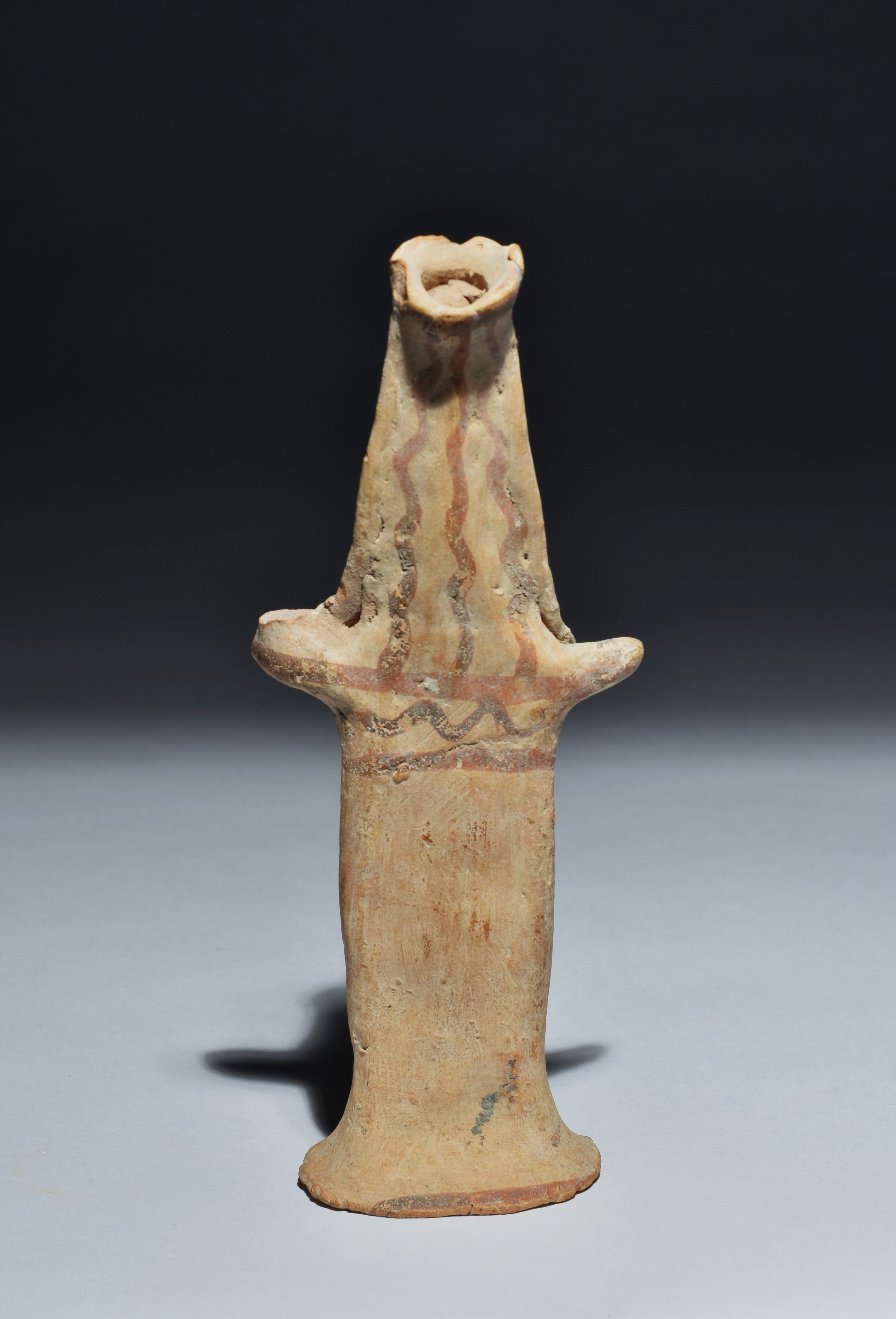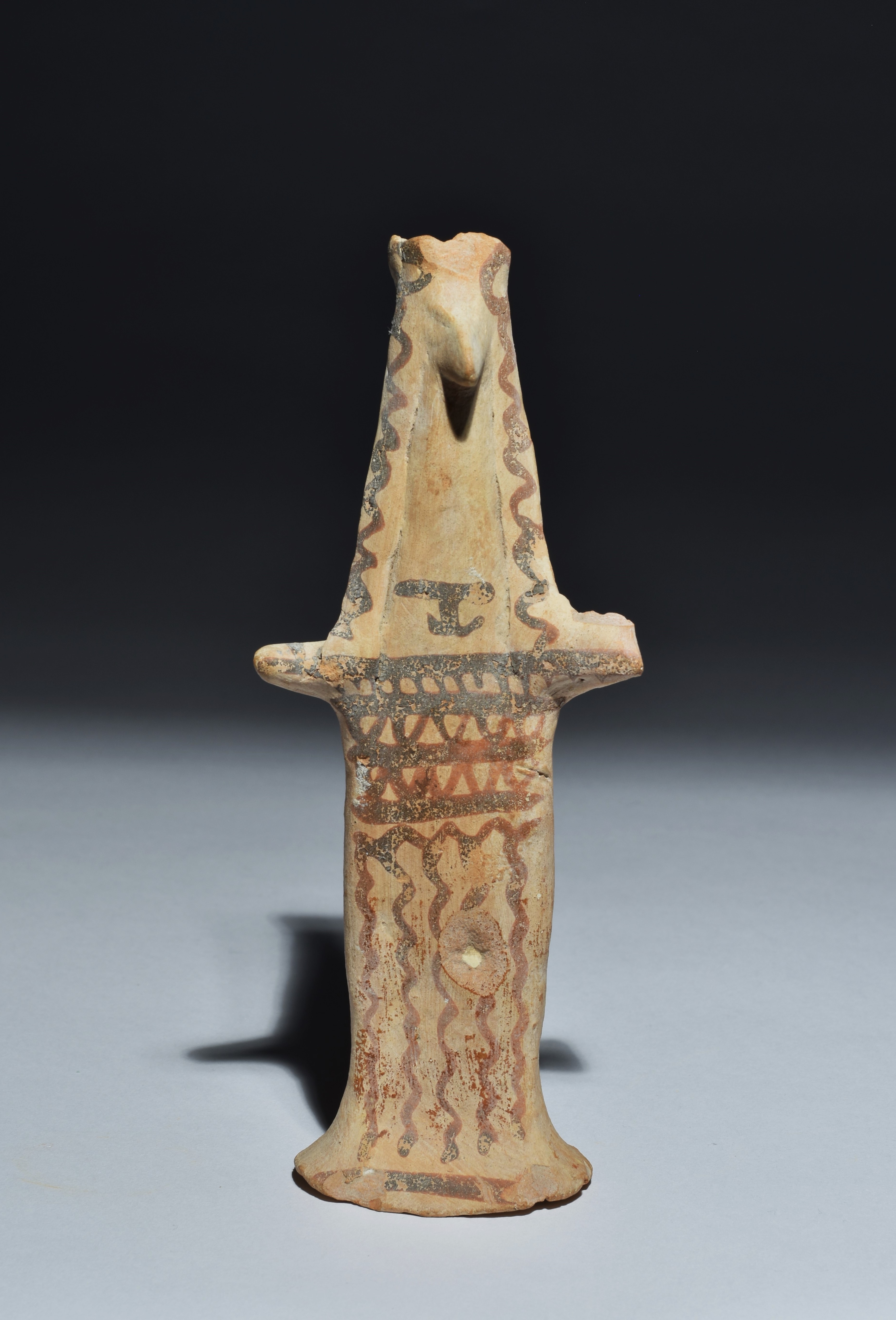 Female idol with flat body, short arms and long neck. It wears a polos headdress on its bird-like head. Attached clay strips form the long hair, which is indicated by wavy lines. The details of the patterns on the garment and the jewellery are painted in a dilute clay slip. Unbroken; losses to polos, left arm, lower body and foot area.