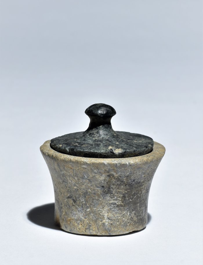 Small bowl with flat bottom and incurved outer wall. The inside is drilled out in accordance to the wall. Vessel and lid unbroken; small chips at rim and bottom of the vessel and at lid. Lid may not belong to it.