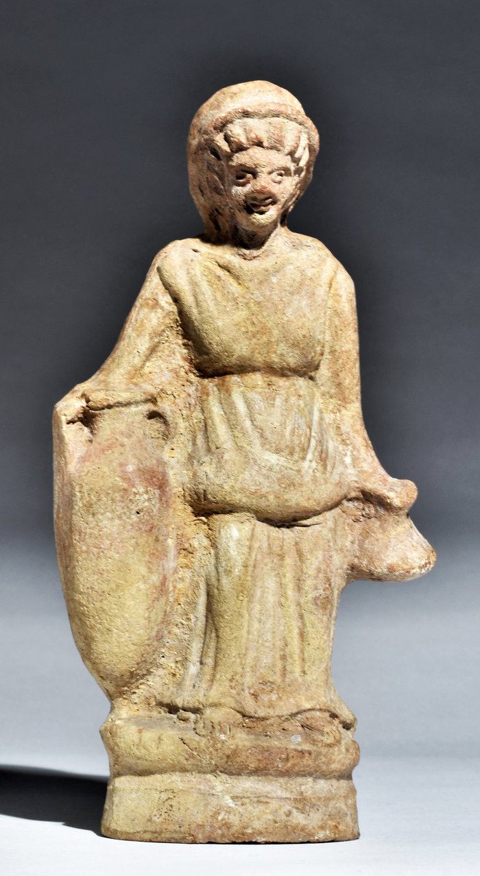Standing, barefoot female figure on an oval base, wearing a belted peplos and cloth cap, carrying an oinochoe in her left hand, her right arm dipped into a large amphora. Upper part recomposed from fragments; a vent hole at the back.