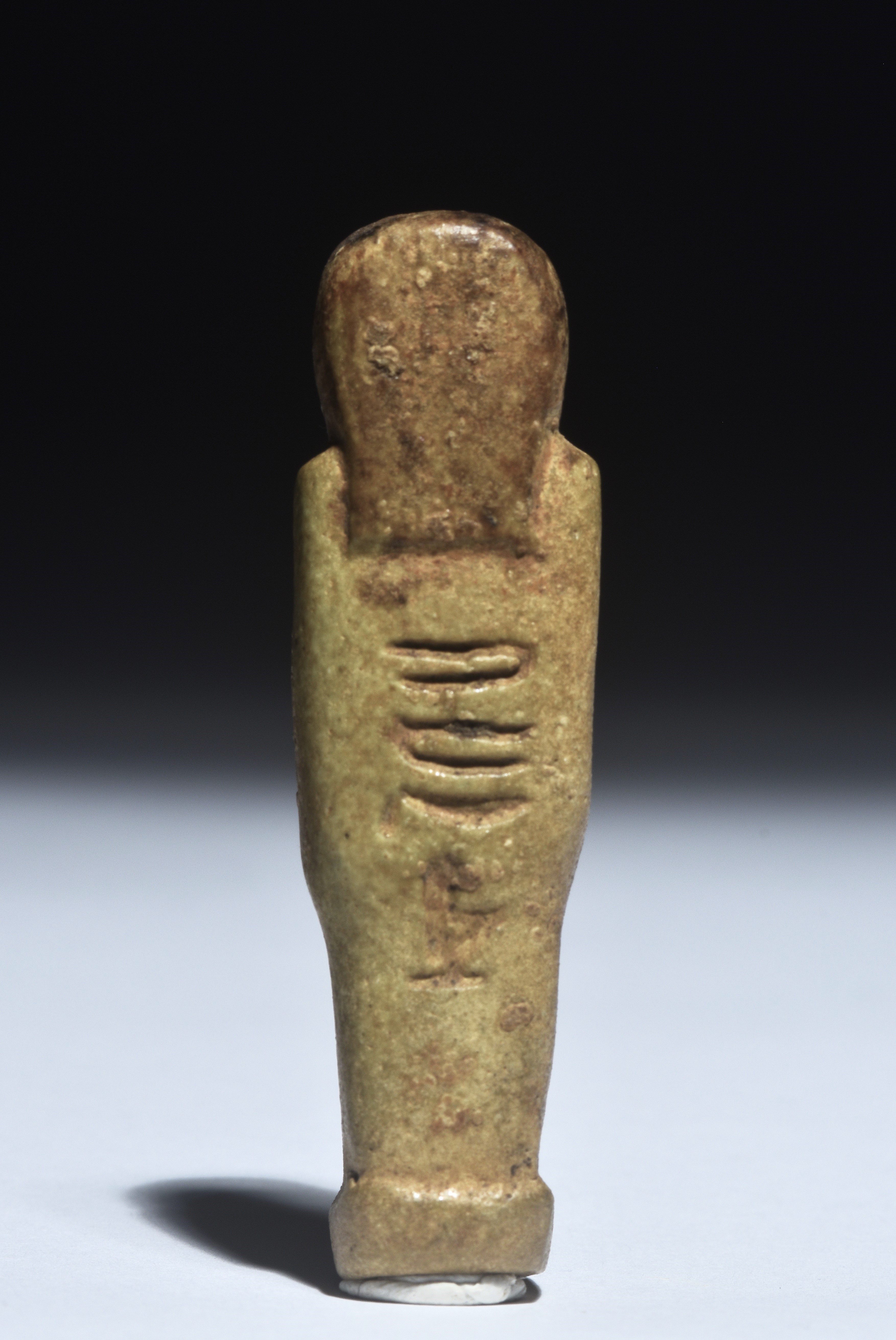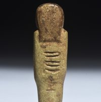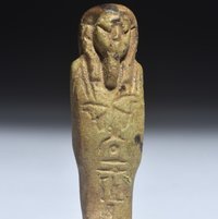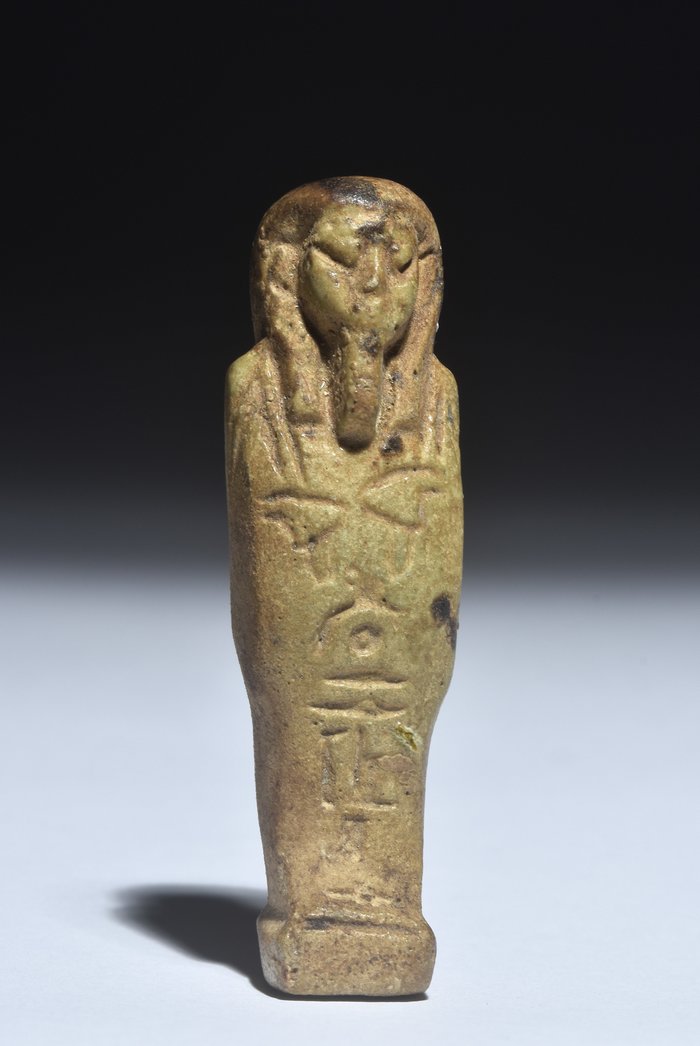 Uschebti in typischer Mumienform mit eingravierten Hieroglypheninschriften auf der Vorder- und Rückseite. Er trägt eine dreigeteilte Perücke und den Götterbart. In den Händen hält er zwei Handpflüge. Intakt.