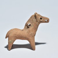 Statuette eines Pferdes mit kurzen Beinen, langem Hals mit durchbohrter Mähne, kurzem Schwanz und senkrecht hochstehenden Ohren. Das Maul ist ebenfalls durchbohrt. Die Augen sind durch Löcher angeben. Intakt.