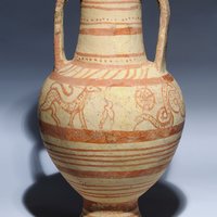 Ovoider Gefäßkörper mit langem Hals, weiter Mündung mit flachem Rand, trompetenartigem Fuß und zwei Henkeln. Auf dem Gefäßkörper ein Fries mit einem Vogel mit ausgebreiteten Flügeln, einem Wildschwein, einem Panther, einer stehenden männlichen Figur, einer Scheibe, einer Schlange, welche einem Greif vor ihr in den Schwanz beißt. Intakt. Ein ähnliches Stück im Allard Pierson Museum Amsterdam.