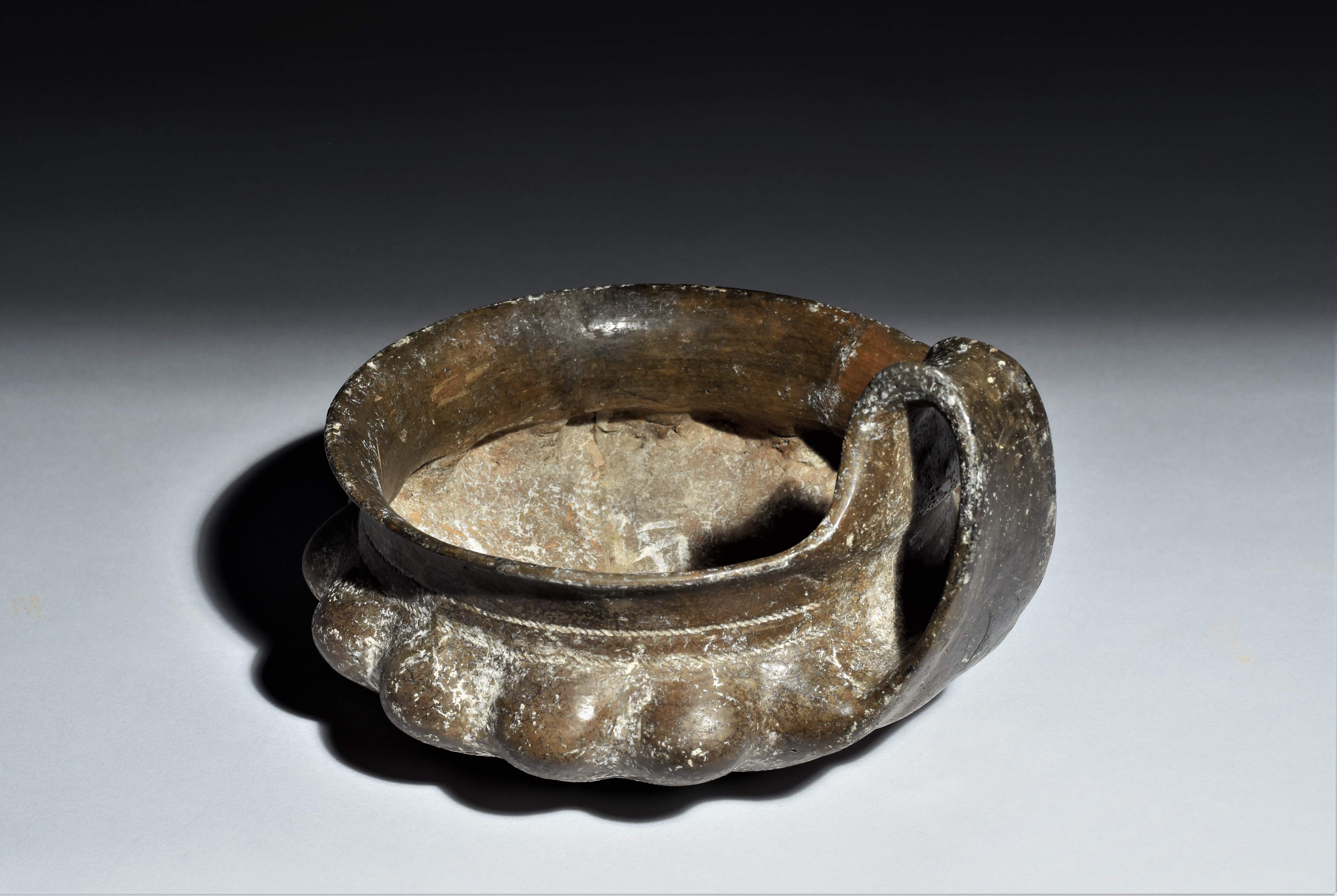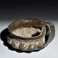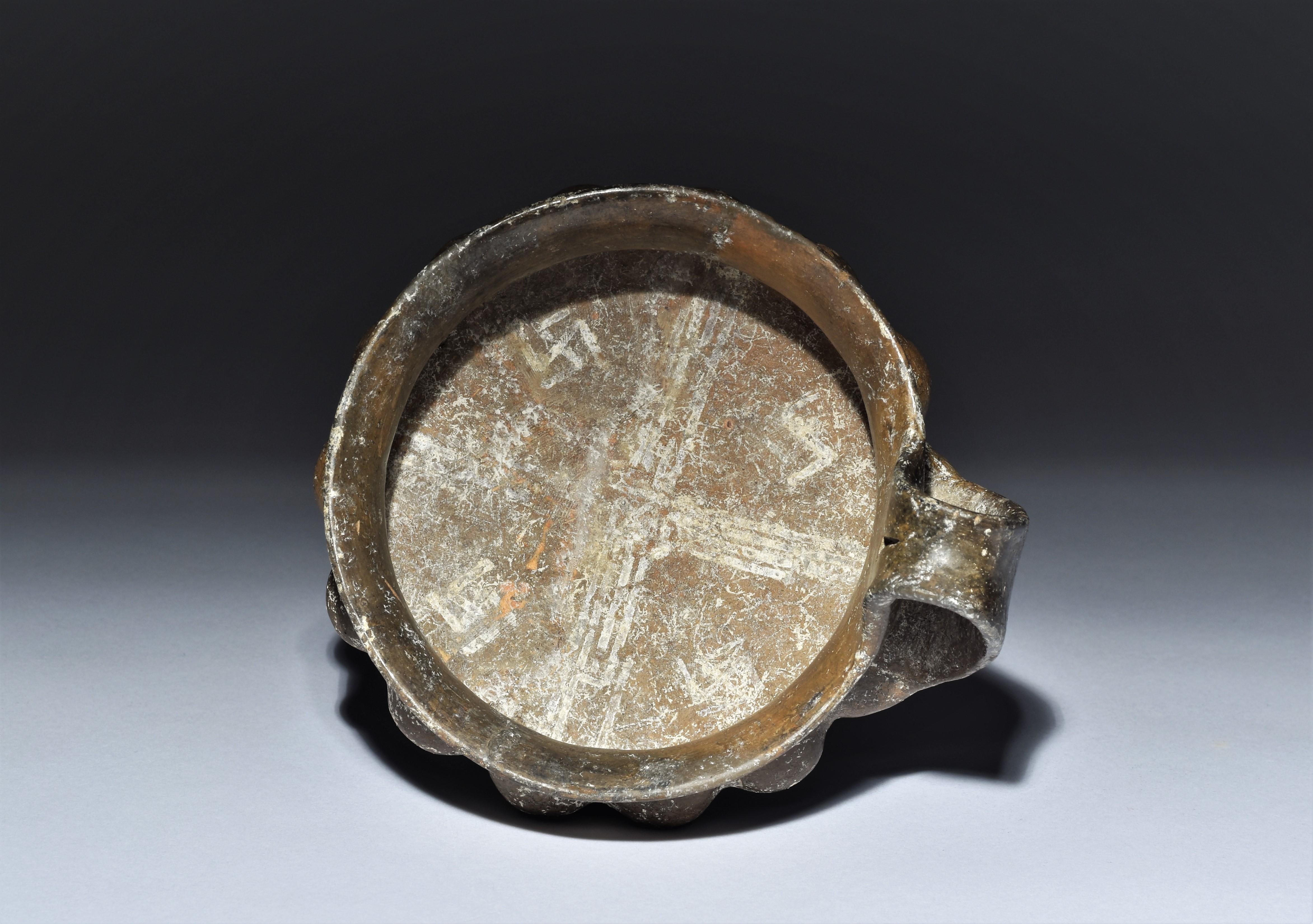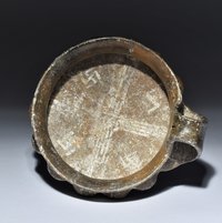 Im Inneren des Gefäßes ein großes Kreuz bestehend aus je vier parallel verlaufenden, weißen Linien. Dazwischen vier weiße Swastiken. Zusammengesetzt, kleine Ergänzungen.