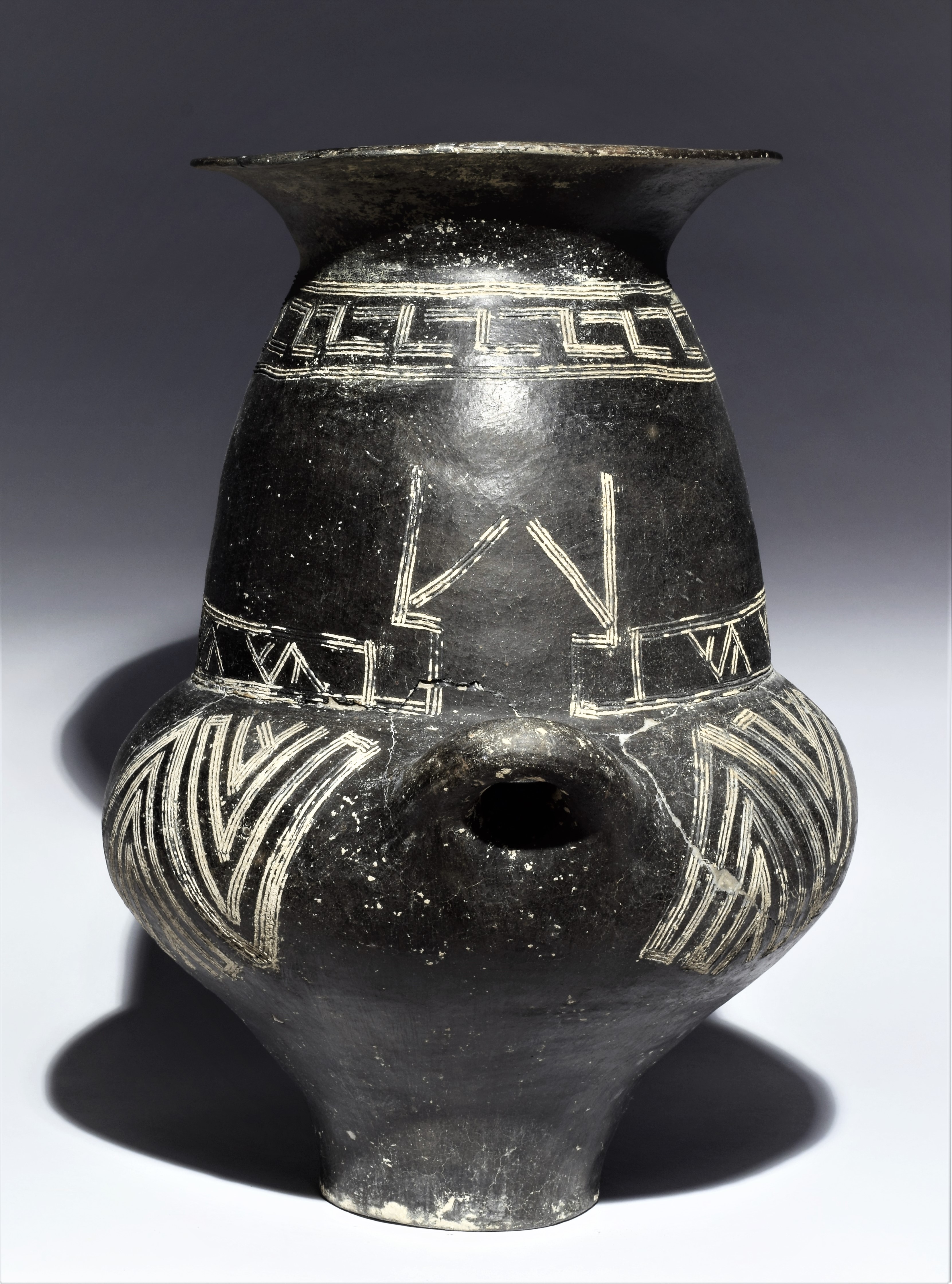 Urne mit einem Henkel, bauchigem sich nach oben verjüngendem Gefäßkörper, abgesetzter Schulter und trichterförmigem Rand. Der Gefäßkörper ist mit Ritzdekor bestehend aus Winkelmustern, umlaufenden Linien und einem geometrischem Muster unterhalb des Randes verziert. Zusammengesetzt.
