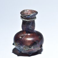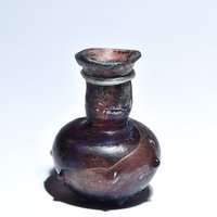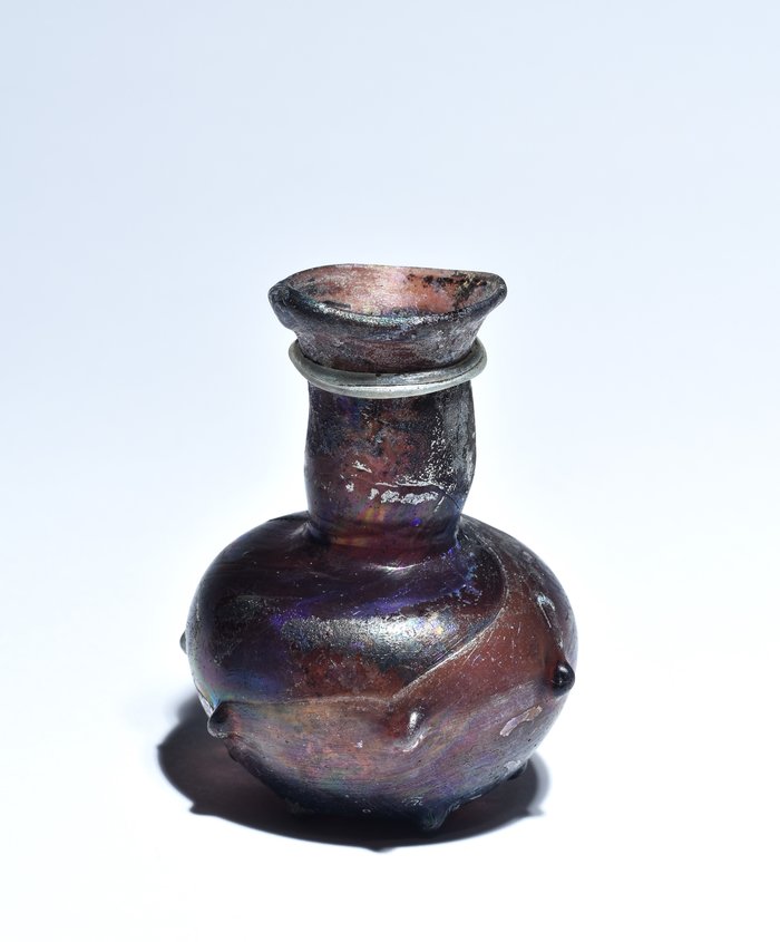 Frei geblasenes Gefäß mit sechs gezwickten Nuppen im unteren Bereich und sieben Nuppen im oberen Bereich des bauchigen Gefäßkörpers, zylinderförmigem Hals und trichterförmiger Mündung. Unterhalb der Mündung ein aufgelegter, umlaufender grünlicher Faden. Intakt.