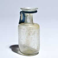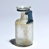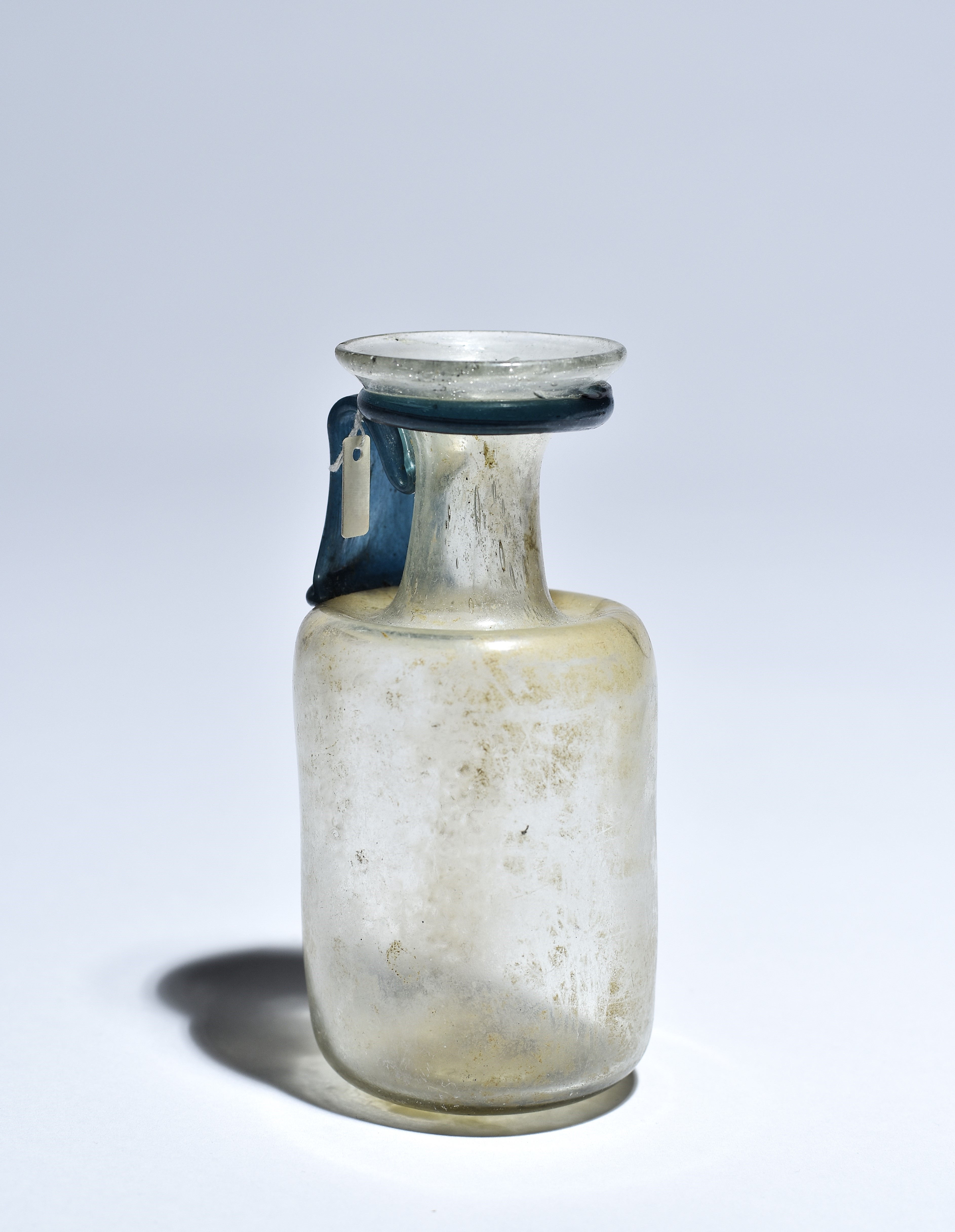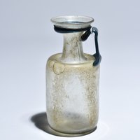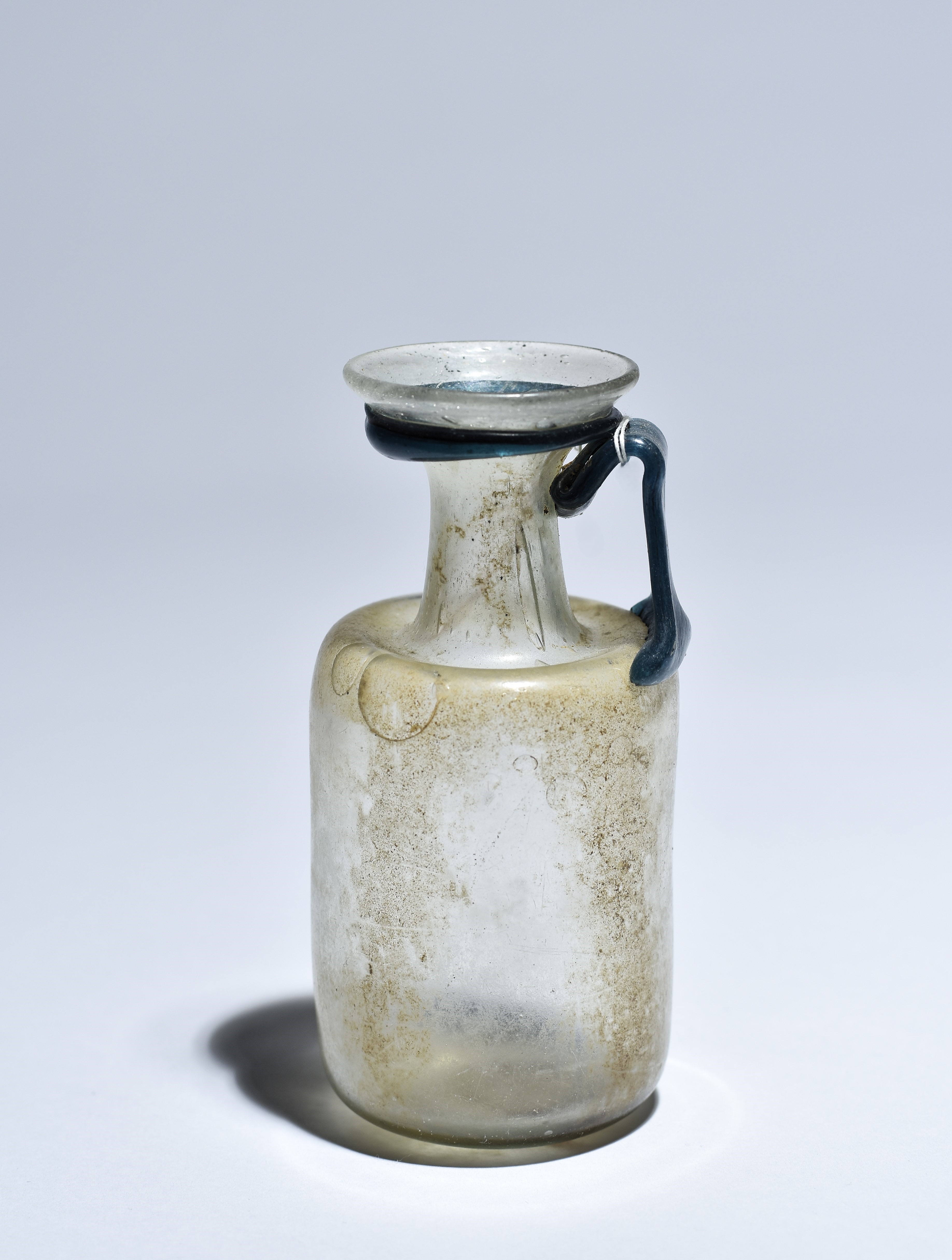 Frei geblasener, zylinderförmiger Gefäßkörper mit konischem, in einer Trichtermündung auslaufenden Hals und angesetztem Bandhenkel aus blauem Glas; unter der Mündung ein dicker blauer Spiralfaden. Intakt.