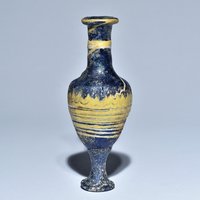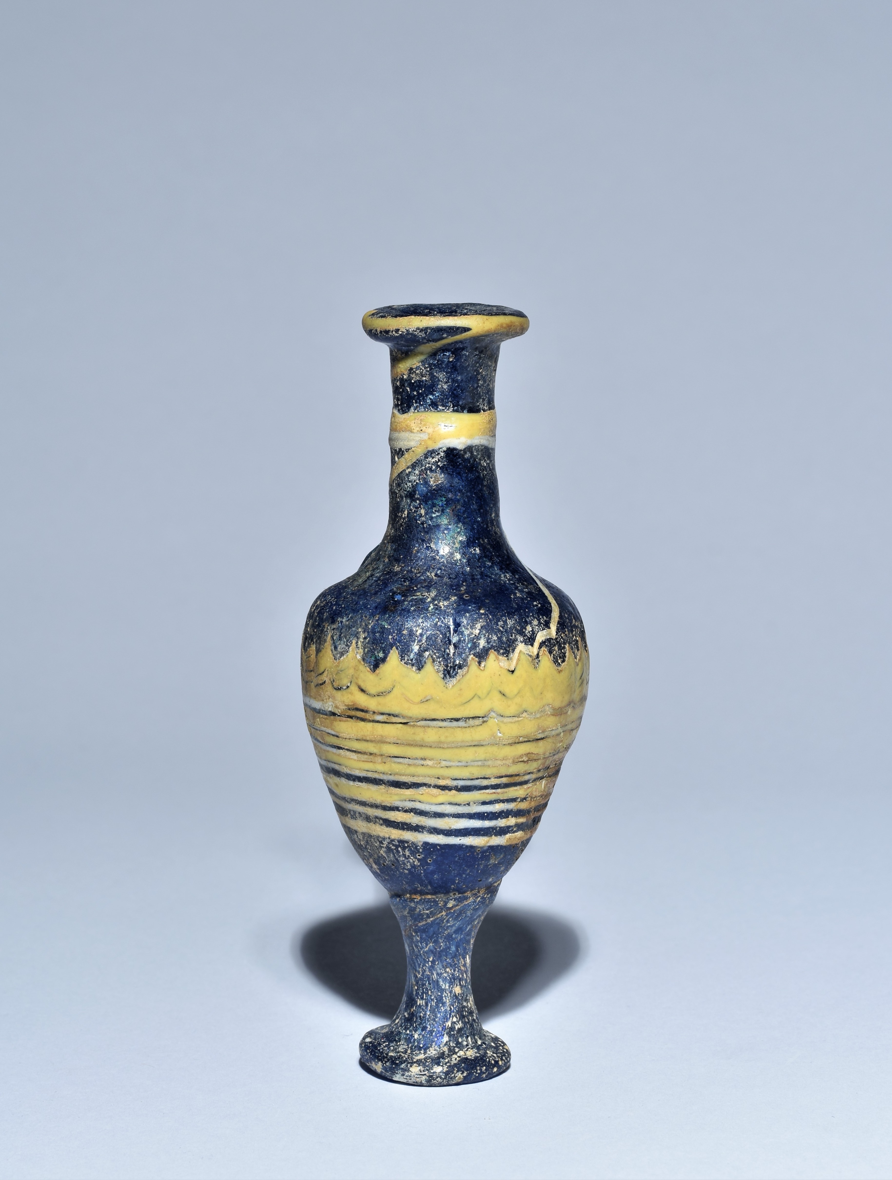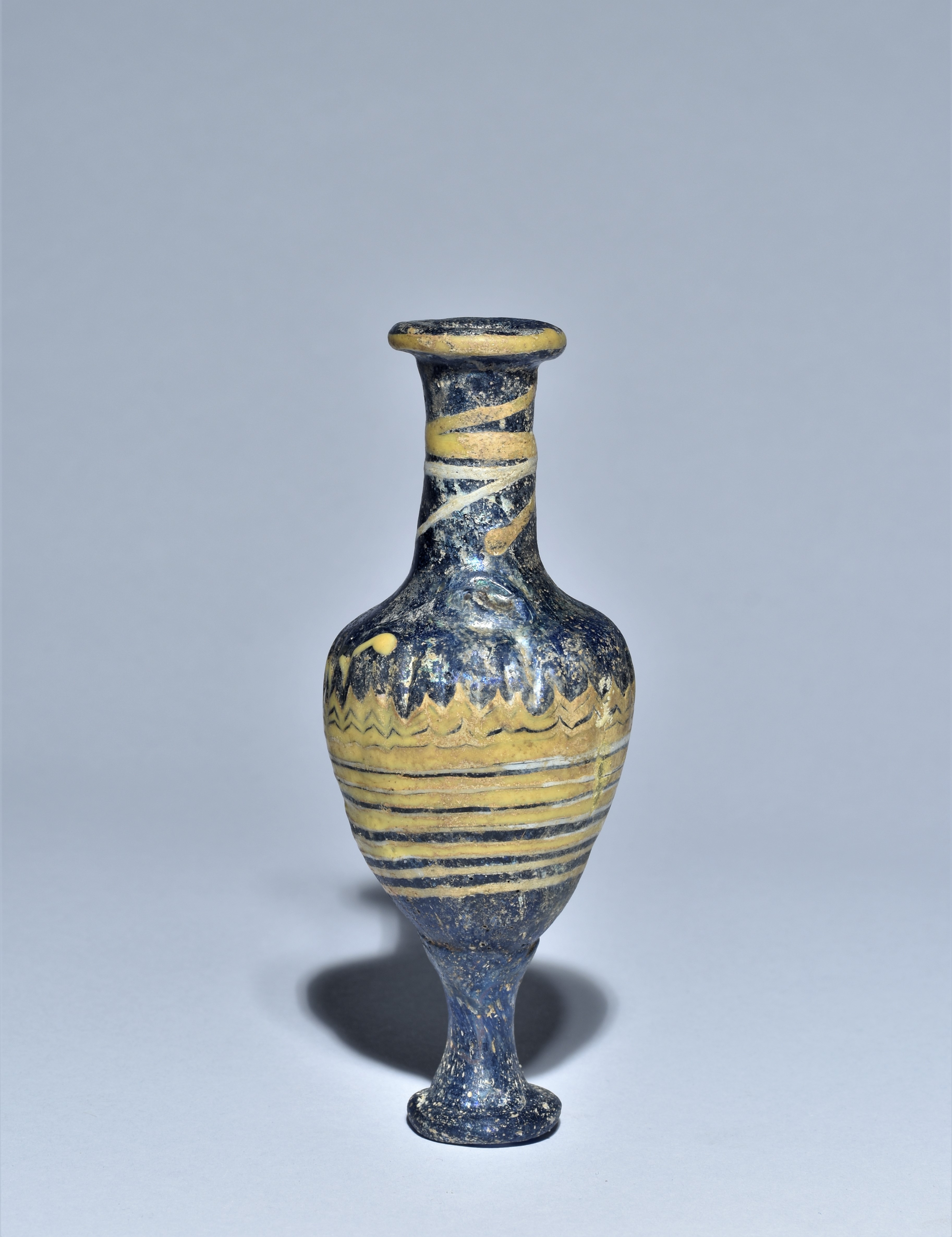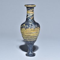 Alabastron in Sandkerntechnik mit ovoidem Korpus und angesetztem, hohen Fuß, langem, zylindrischen Hals und flacher Mündung. Der Gefäßkörper sowie der Hals sind mit opak gelben und weißen Spiralfäden dekoriert. Der gelbe Faden dekoriert zusätzlich den Mündungsrand. Der obere Teil des Gefäßkörpers ist gekämmt und mit Dellen verziert. Aus großen Fragmenten zusammengesetzt; winzige Fehlstelle ergänzt.