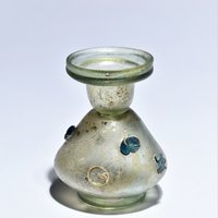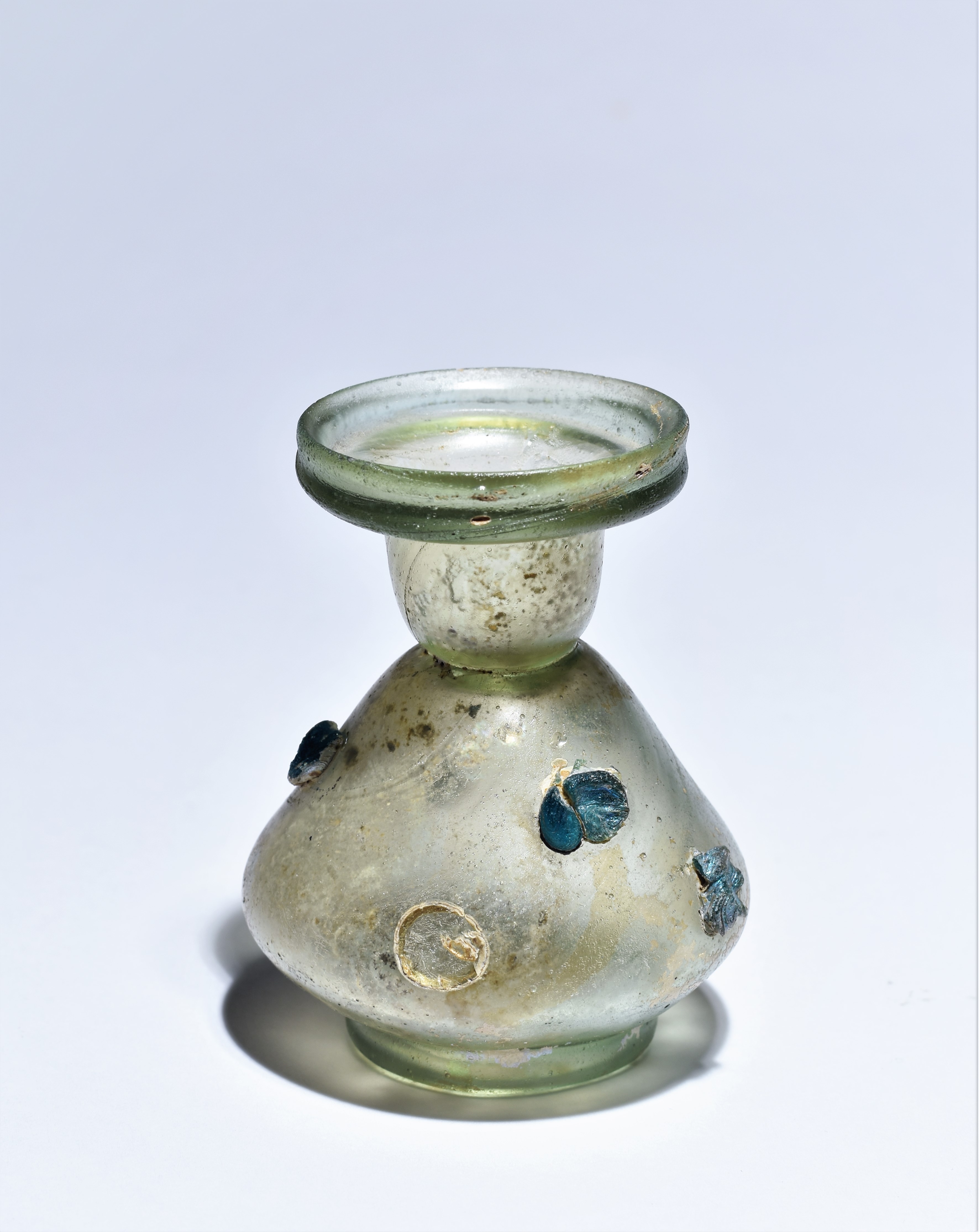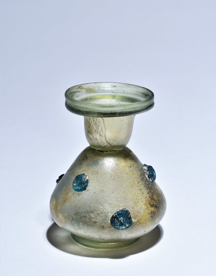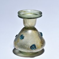Frei geblasener Gefäßkörper mit einer Verengung zum zylinderförmigen Hals mit weit nach außen gebogenem Rand. Auf dem Korpus sechs aufgesetzte blaue Nuppen. Eine Nuppe fehlt.